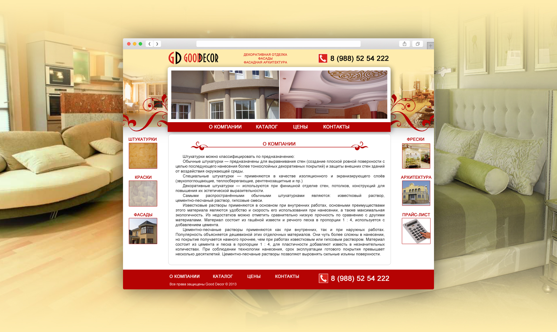 Основним завданням була розробка логотипу компанії, а також дизайну для сайту візитки. Поєднання червоних і жовтих кольорів дозволило нам створити приємний на вигляд дизайн сайту, що викликає тільки «теплі» асоціації. Оригінальним ходом був поділ розділів сайту з боків головної сторінки, що зробило сайт більш компактним.