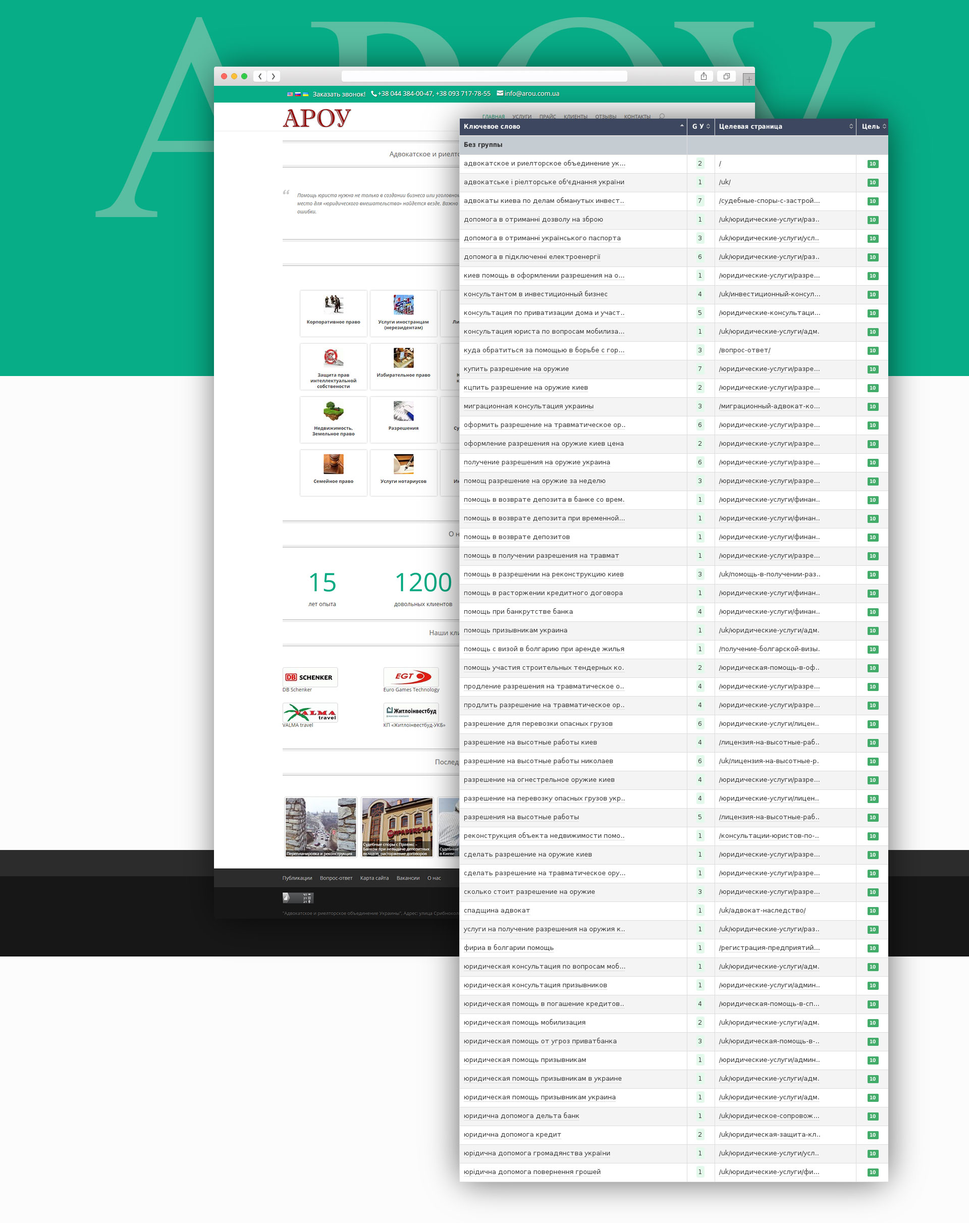 Про проект: Юридична компанія «АРОУ» - велика компанія, що надає широкий спектр юридичних послуг. Вже не перший рік є однією з лідируючих компаній Києва.