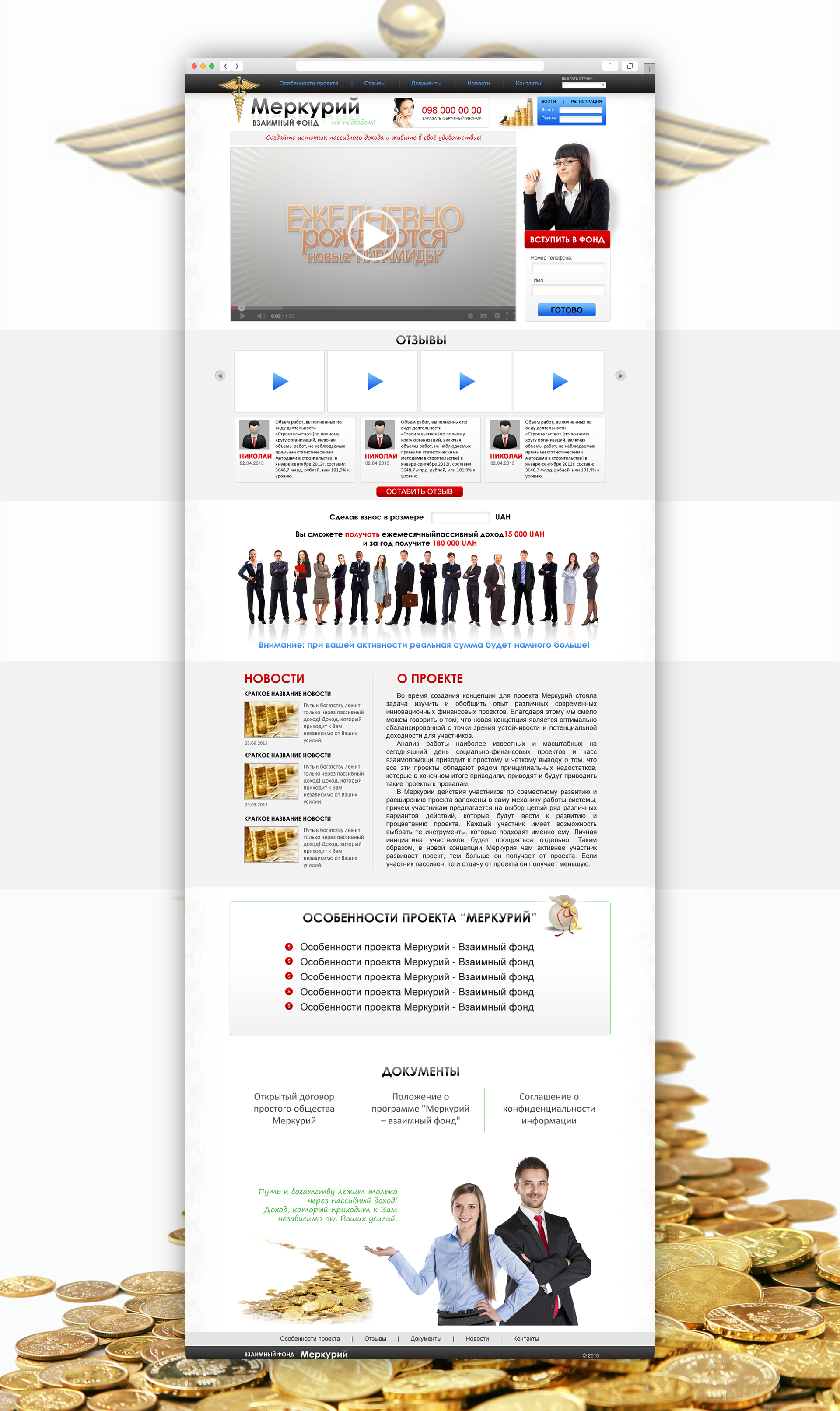 Головною метою в розробці дизайну для фонду «Меркурій» було залучення клієнтів з максимальною конверсією. Тому було прийнято рішення зробити головну сторінку у вигляді Landing Page. Для залучення максимально широкої аудиторії, ми розмістили відео про діяльність фонду під шапкою сайту, а також відео відгуки задоволених клієнтів, що дало непоганий результат в конверсії. Так само було прийнято рішення поставити переваги фонду на головній сторінці та встановити можливість написання відгуків про фонт безпосередньо на сайті.