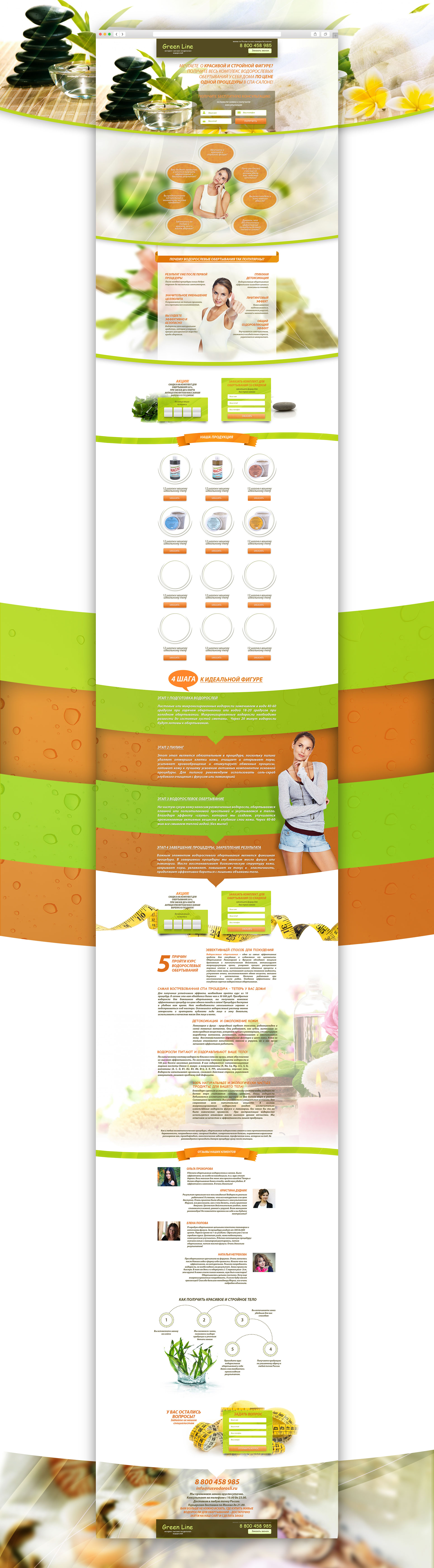 Для створення сторінки інтернет-магазину, що продає натуральні водорості, було прийнято рішення розробити колірну гамму в салатовому і помаранчевому кольорі. Акцент був зроблений на властивостях продукції та її результатах. Для збільшення конверсії був поставлений лічильник аукціонної знижки, спонукає на покупку.